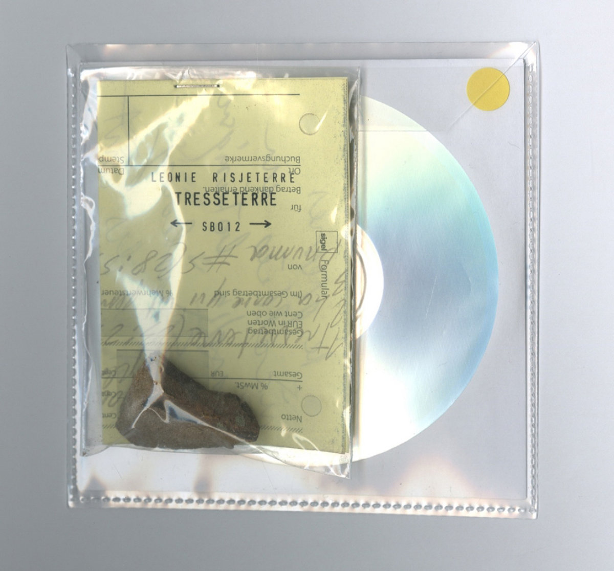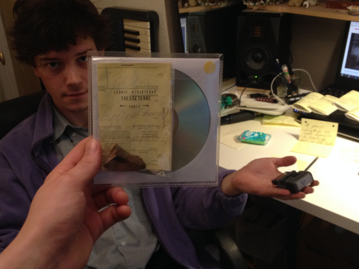 The limited edition CD-R of Léonie Risjeterre's Tresseterre comes packaged in hand made artwork, each copy is stamped, signed and numbered, with all credits and information written by hand, and features a unique piece of stone stolen from Strasbourg's botanical gardens. Limited edition of 100 copies!